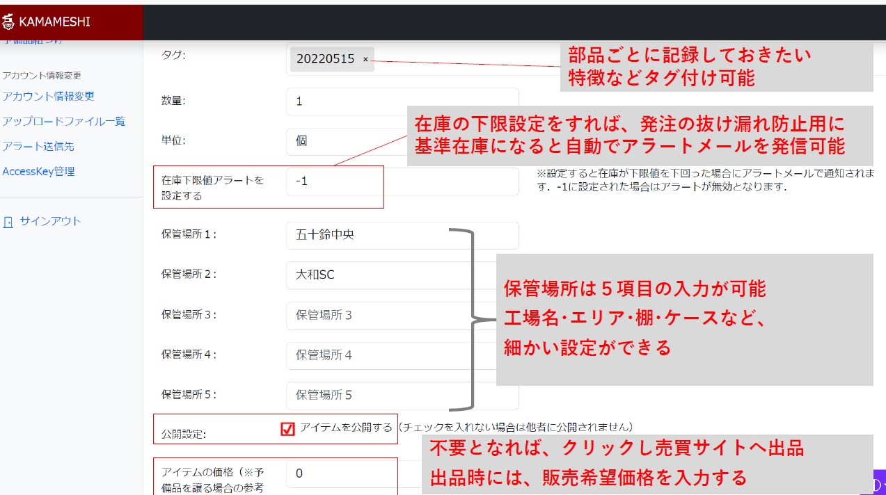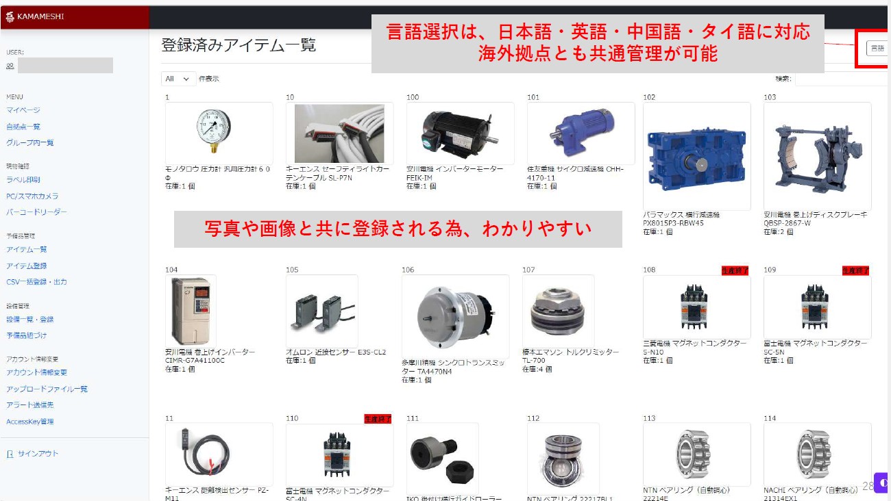 工場や倉庫に点在する部品や工具をQRコードで登録し、クラウド上で一元管理。