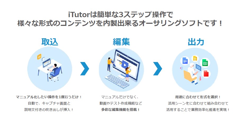 iTutorは簡単な3ステップ操作で様々な形式のコンテンツを内製出来るオーサリングソフトです!