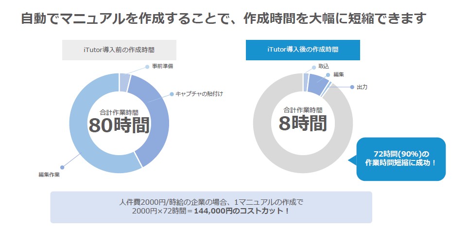 iTutorは、業務マニュアル作成の工数を大幅に削減し、教育・研修・システム導入時の負担を軽減します。