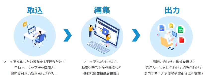 普段の操作をキャプチャするだけで、ドキュメント・動画・eラーニング教材をワンクリックで出力可能。