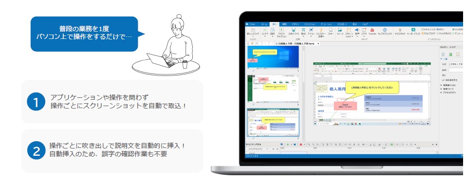 普段のPC操作を記録するだけで、画面キャプチャと説明が自動挿入され、