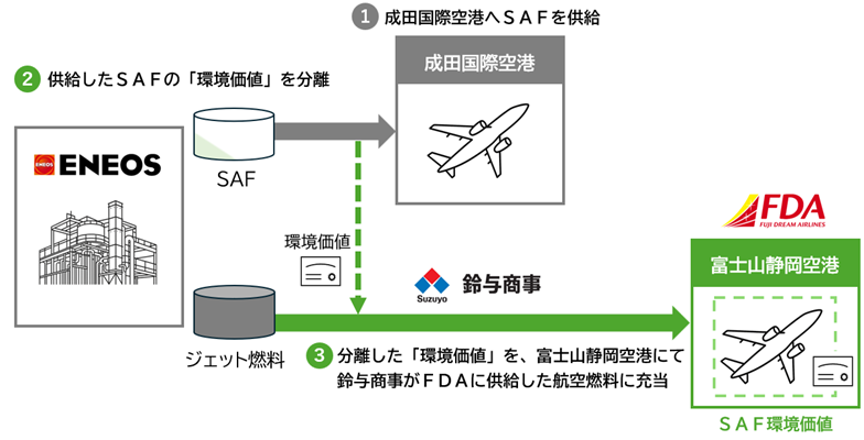 ENEOSが成田国際空港に供給したSAFの「環境価値」を、富士山静岡空港にて鈴与商事がFDAに供給するジェット燃料に割り当てることで、富士山静岡空港にてFDAにSAFを供給します。