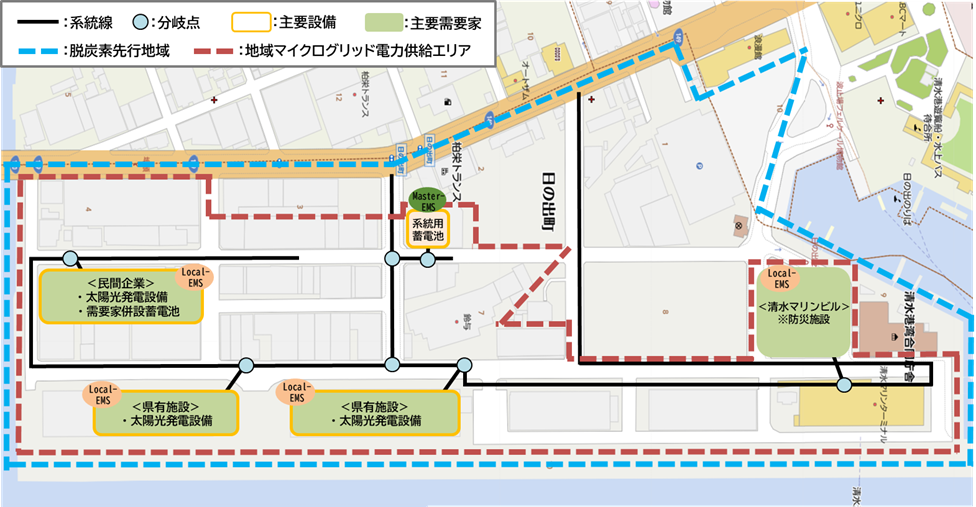 本マイクログリッドは、太陽光発電設備や大型蓄電池、エネルギーマネジメントシステム(EMS)を組み合わせ、平常時は再生可能エネルギーの地産地消を促進し、台風等による長期停電時には地域内で自立的に電力供給を行う仕組みであり、港湾エリアにおける先進的な地域マイクログリッドの構築事例となります。