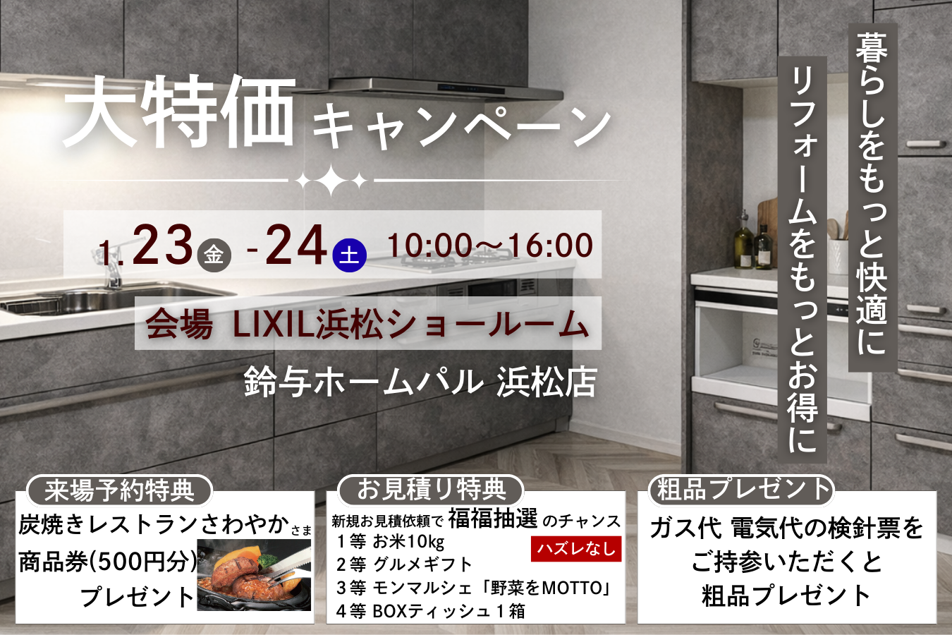 住宅リフォームの鈴与ホームパル 浜松店では、1月23日(金)・24日(土) 各日10時~16時にリクシル浜松ショールームにて住まいの”リフォーム相談会”を開催いたします!