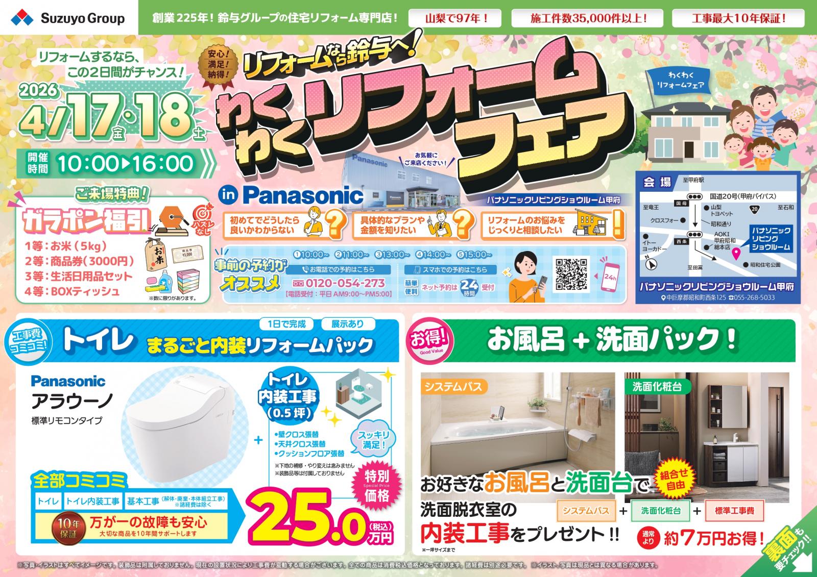 鈴与ホームパル 甲府店では、4月17日(金)~18日(土) 各日10時~16時にパナソニックリビングショウルーム甲府にて、住まいの”わくわくリフォームフェア”を開催します!