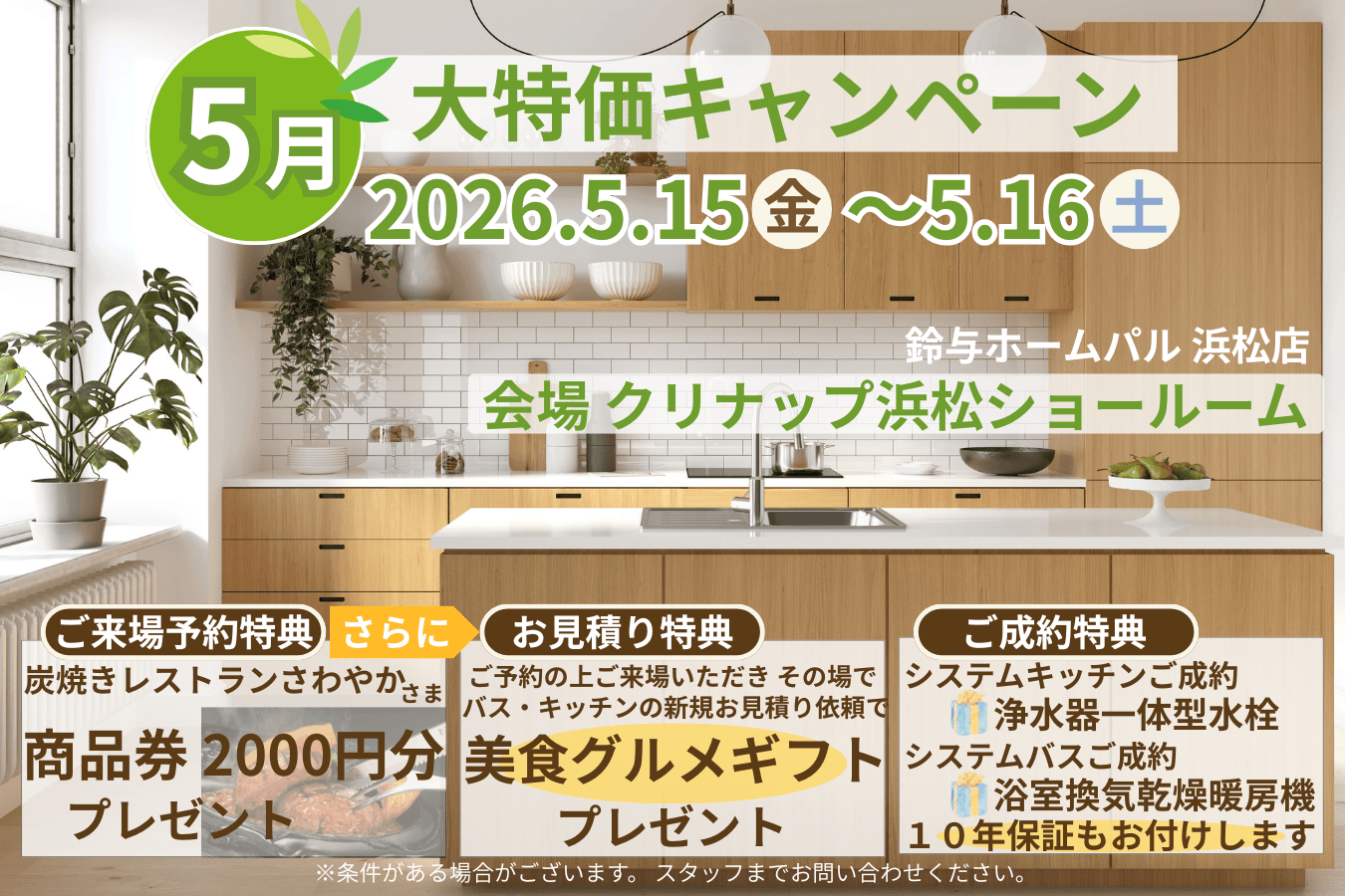 鈴与ホームパル 浜松店では5月15日(金)~16日(土) 各日10時~16時にクリナップ浜松ショールームにて”住まいのリフォームフェア”を開催します!